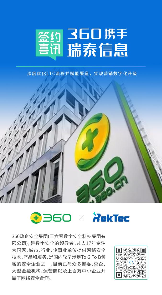 近日,360政企安全集團(tuán)(三六零數(shù)字安全科技集團(tuán)有限公司,以下簡(jiǎn)稱:360)攜手瑞泰信息,再度聯(lián)手打造360政企安全CRM三期項(xiàng)目。
