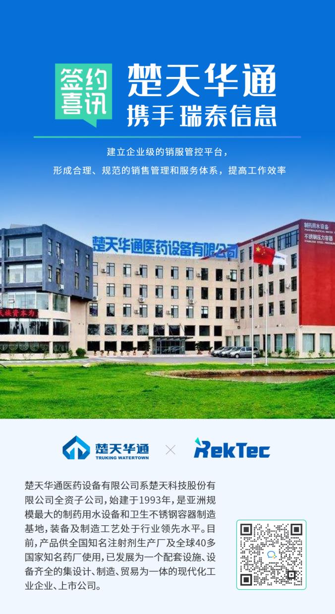 近日,楚天華通醫藥設備有限公司(以下簡稱:楚天華通)與瑞泰信息達成深度戰略合作,共建企業級“銷服一體化”管控平臺,形成合理、規范的銷售管理和服務體系,提高工作效率。