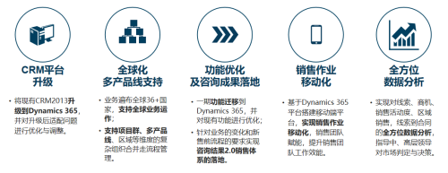 本次豐尚智能科技CRM項目將現有CRM2013升級到Dynamics 365,對公司系統架構和功能做了統一的升級和優化,充分考慮了豐尚科技全球化的布局以及服務全球行業領先客戶的需求,涵蓋歐洲、美洲和亞洲三大區域,建立了全球統一的數字化營銷管理服務平臺。此外,項目還將一期功能進行遷移并進行優化的同時,針對業務的變化和新售前流程的要求進行新需求的實施落地,對銷售團隊工作進行移動化管理,并實現從線索到合同的的全方位數據分析。