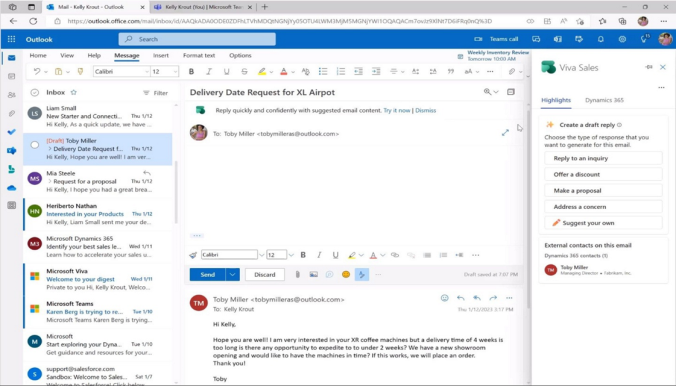 其次,將SalesONE與AI結合,幫助銷售團隊快速回應客戶的詢問,提供產品信息、報價等信息,實現輕松銷售跟進;銷售跟進過程中通過outlook、teams等與客戶互動時,快速生成郵件內容,會議紀錄、整理并進行摘要總結;對銷售跟進與訂單交付數據進行分析,并進行異常預警。
