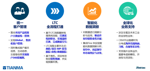 公司消費(fèi)品部門(mén)和車(chē)載事業(yè)部原有的系統(tǒng)升級(jí)到最新D365平臺(tái),工業(yè)品事業(yè)部的系統(tǒng)在升級(jí)優(yōu)化的基礎(chǔ)上,實(shí)現(xiàn)客戶(hù)管理流程集團(tuán)化、統(tǒng)一化管理。此外,搭建了多個(gè)系統(tǒng)及LTC全流程管理服務(wù),建立集團(tuán)與客戶(hù)的統(tǒng)一管理,在系統(tǒng)優(yōu)化和數(shù)據(jù)完整基礎(chǔ)上,形成了有效的數(shù)據(jù)洞察能力,助力天馬微電子增加銷(xiāo)售效率的同時(shí),也提升的客戶(hù)滿(mǎn)意度。